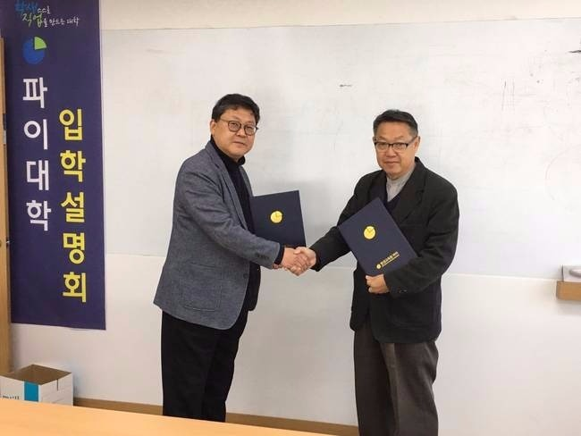 파이대학(대표 김주영)과 한·인도차이나협력센터(대표 이희석)은 지난 11일 MOU를 체결하고 상호 협력을 다짐했다. 캄보디아 헤브론유스 FC단장을 겸하고 있는 이 날 이희석 대표는 본교를 방문해 파이대학의 캄보디아 진출을 적극 도울 것을 약속했다.